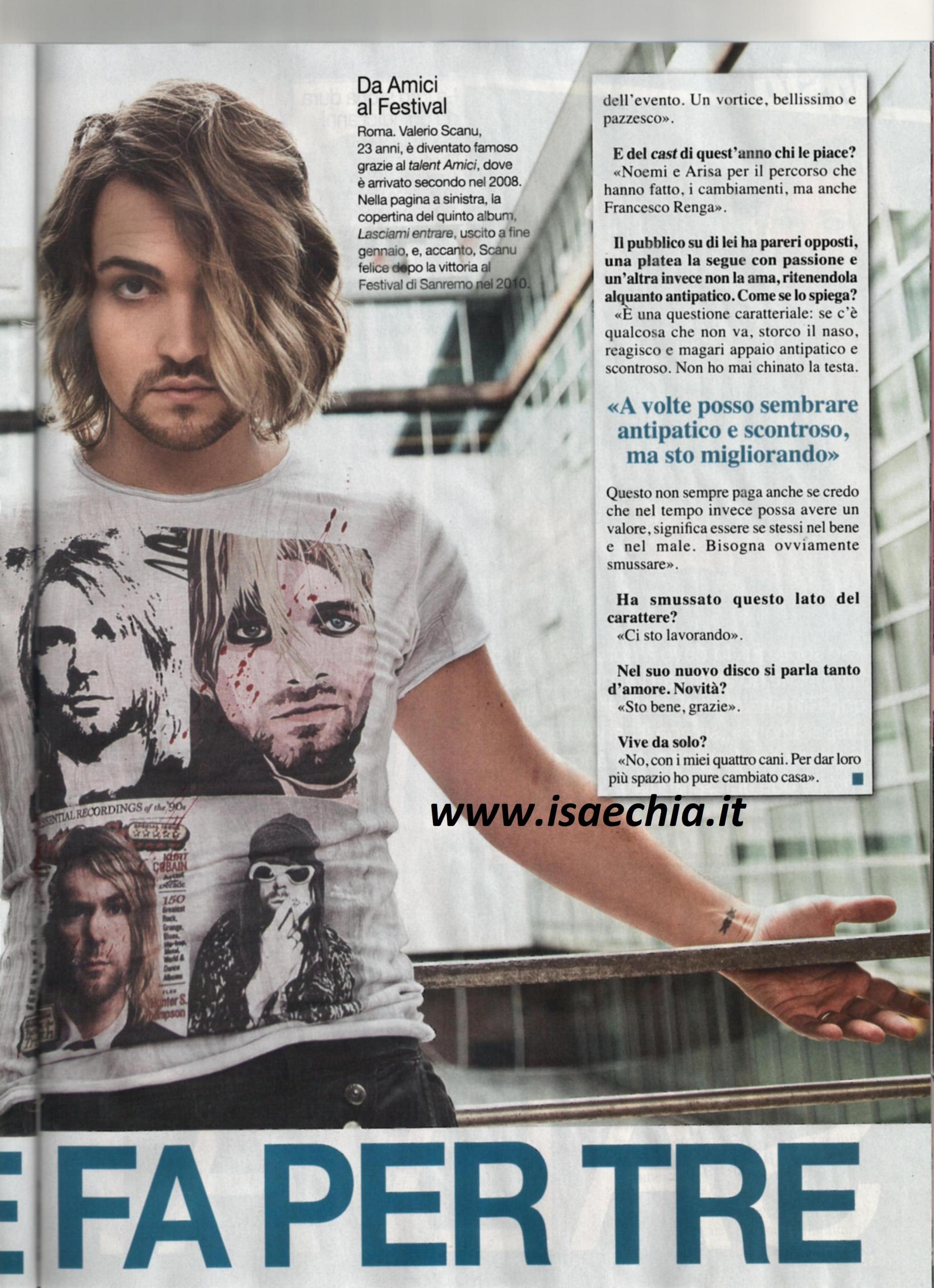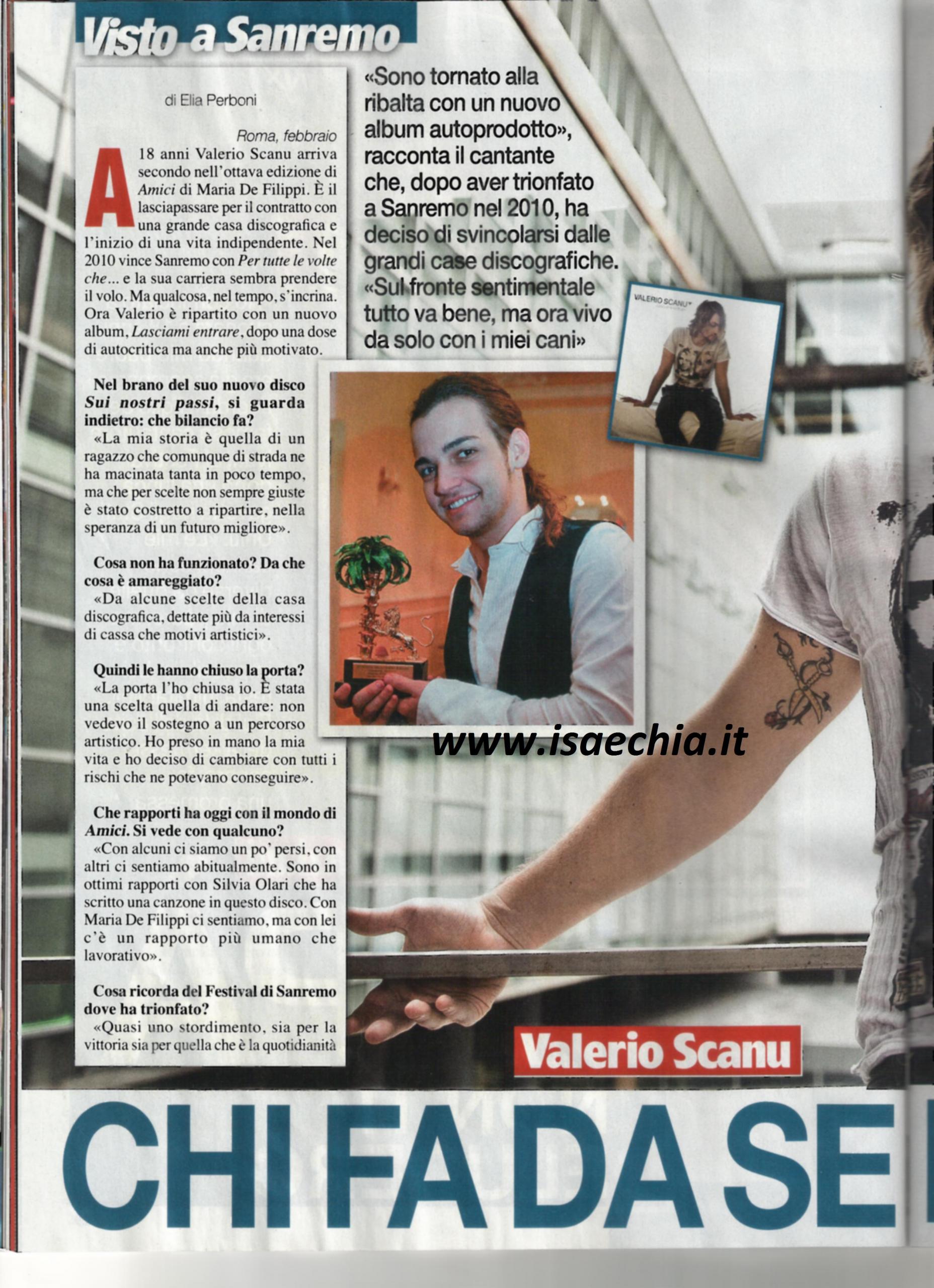 L’ex concorrente di Amici Valerio Scanu torna con un nuovo album, Lasciami entrare: “Nel brano Sui nostri passi faccio un bilancio. La mia è la storia di un ragazzo che ha macinato tanta strada in poco tempo, ma che per scelte non sempre giuste è stato costretto a ripartire, nella speranza di un futuro migliore. Sono amareggiato da alcune scelte della casa discografica, che erano più dettate da interessi economici che artistici. La porta l’ho chiusa io: non vedevo un sostegno a un percorso artistico e ho deciso di cambiare con tutti i rischi che ne potevano conseguire. Sento alcuni di Amici regolarmente, come Silvia Olari, che ha scritto una canzone in questo disco. Con Maria De Filippi ci sentiamo, c’è un rapporto più umano che lavorativo. Il festival di Sanremo lo ricordo come uno stordimento, un vortice”. Quando gli si chiede come mai una fetta di pubblico lo trova antipatico, risponde: “Se c’è qualcosa che non va, storco il naso, reagisco e magari sembro antipatico e scontroso. Non ho mai chinato la testa. Bisogna ovviamente smussare questo lato e ci sto lavorando”. Infine, quando gli si chiede dell’amore, risponde solo: “Sto bene, grazie. Vivo coi miei quattro cani e per dare spazio a loro ho cambiato anche casa”.