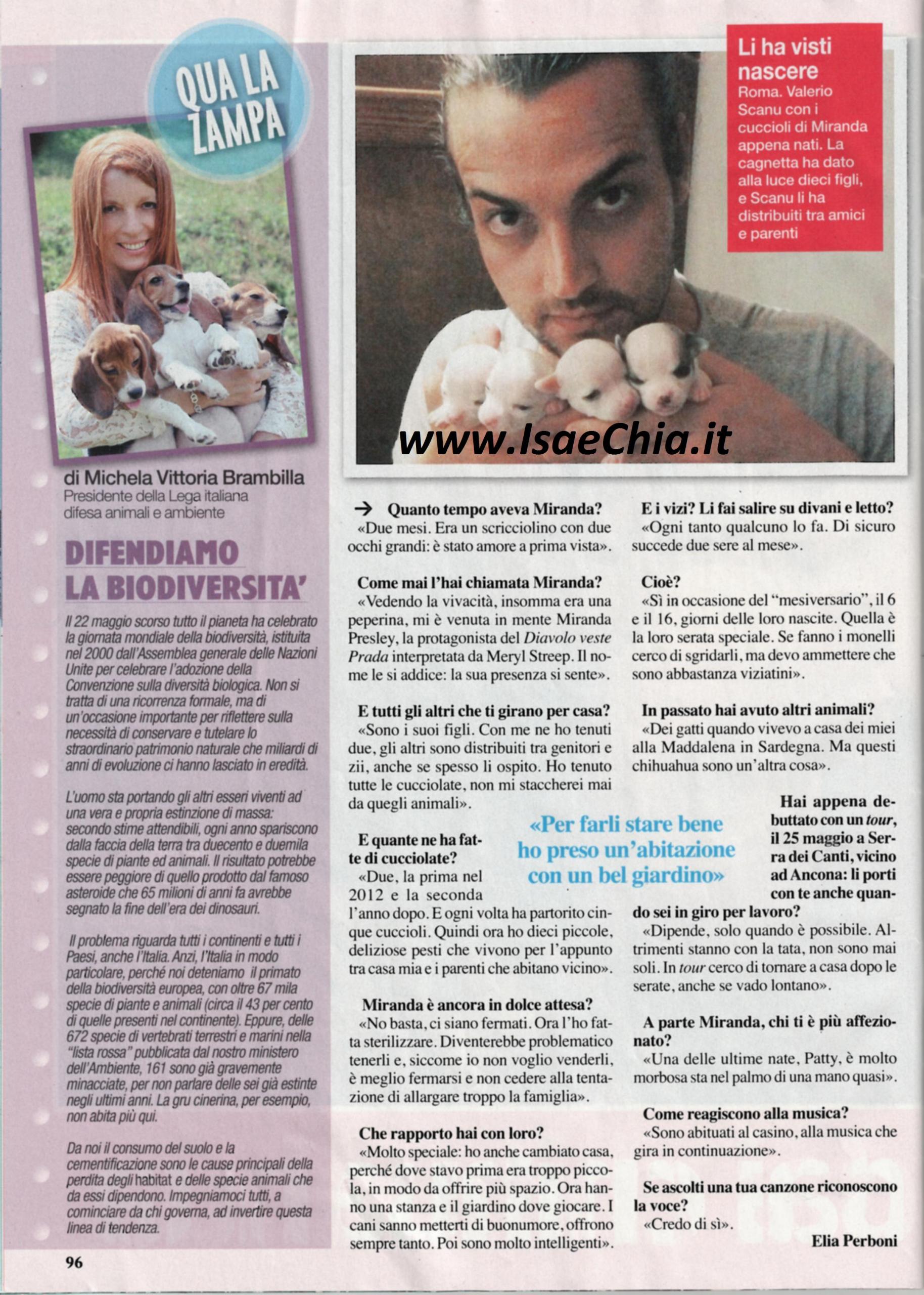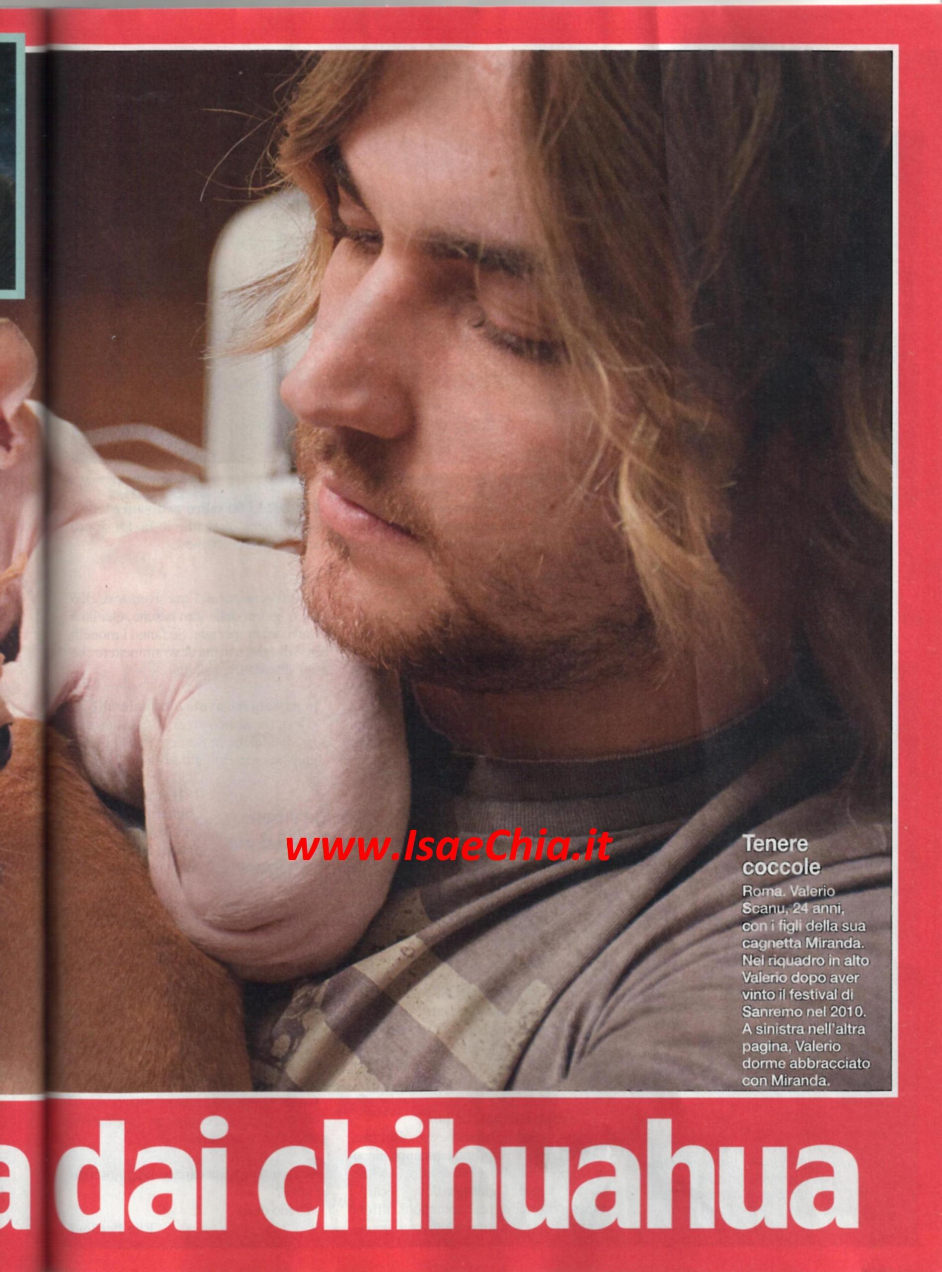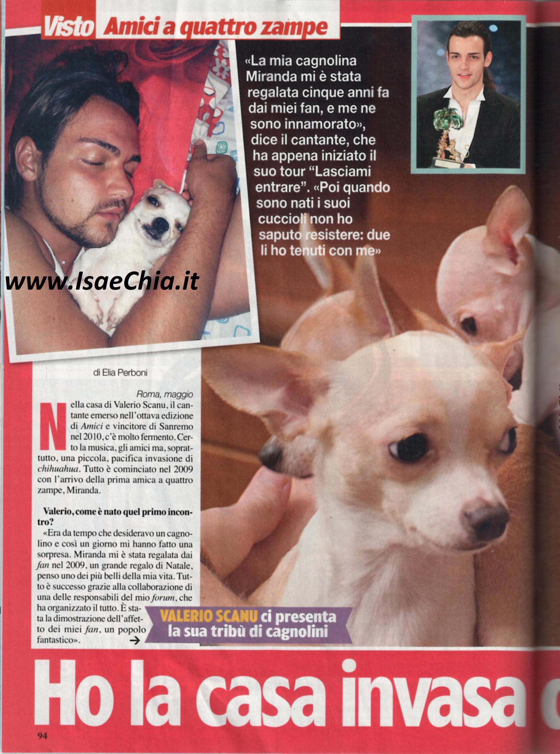 L’ex concorrente di Amici e vincitore del Festival di Sanremo 2010 Valerio Scanu ha un’altra passione oltre la musica, i suoi cani chihuahua. “Miranda mi è stata regalata dai miei fan nel 2009 ed è stata uno dei più bei regali di Natale della mia vita. Era uno scricciolino di due mesi, con due occhi grandi ed è stato amore a prima vista. Vedendo la sua vivacità e il fatto che fosse una peperina, mi è venuta in mente Miranda Presley, la protagonista di Il diavolo veste Prada interpretata da Meryl Streep e ho pensato che il nome le si addicesse. Tutti gli altri cani che si aggirano per casa mia sono i suoi figli: ne ho tenuti due, mentre gli altri li ho distribuiti ai miei genitori e ai miei zii, anche se spesso li ospito. Ho tenuto tutte le cucciolate, non me ne staccherei mai. Ne ha fatte due: una nel 2012 e una l’anno dopo. Ogni volta ha avuto cinque piccoli, quindi ora ho dieci deliziose pesti che vivono tra casa mia e i parenti che ho vicino. Ora però l’ho fatta sterilizzare: siccome non voglio venderli, è meglio non cedere alla tentazione di allargare troppo la famiglia! Con loro ho un rapporto speciale: ho cambiato casa perché quella di prima era troppo piccola. Ora hanno una stanza e un giardino dove giocare. In occasione dei loro “mesiversari”, il 6 e il 16 di ogni mese, organizzo una serata speciale e li vizio, li faccio salire su divani e letti. Quando è possibile li porto con me se mi sposto per lavoro, altrimenti li lascio con la tata; cerco sempre di tornare in serata quando sono in tour, anche se sono lontano. Oltre a Miranda, c’è una delle ultime arrivate, Patty, che è quasi morbosamente attaccata a me. Sono abituati al casino e alla musica e credo che sappiano riconoscere le mie canzoni!”