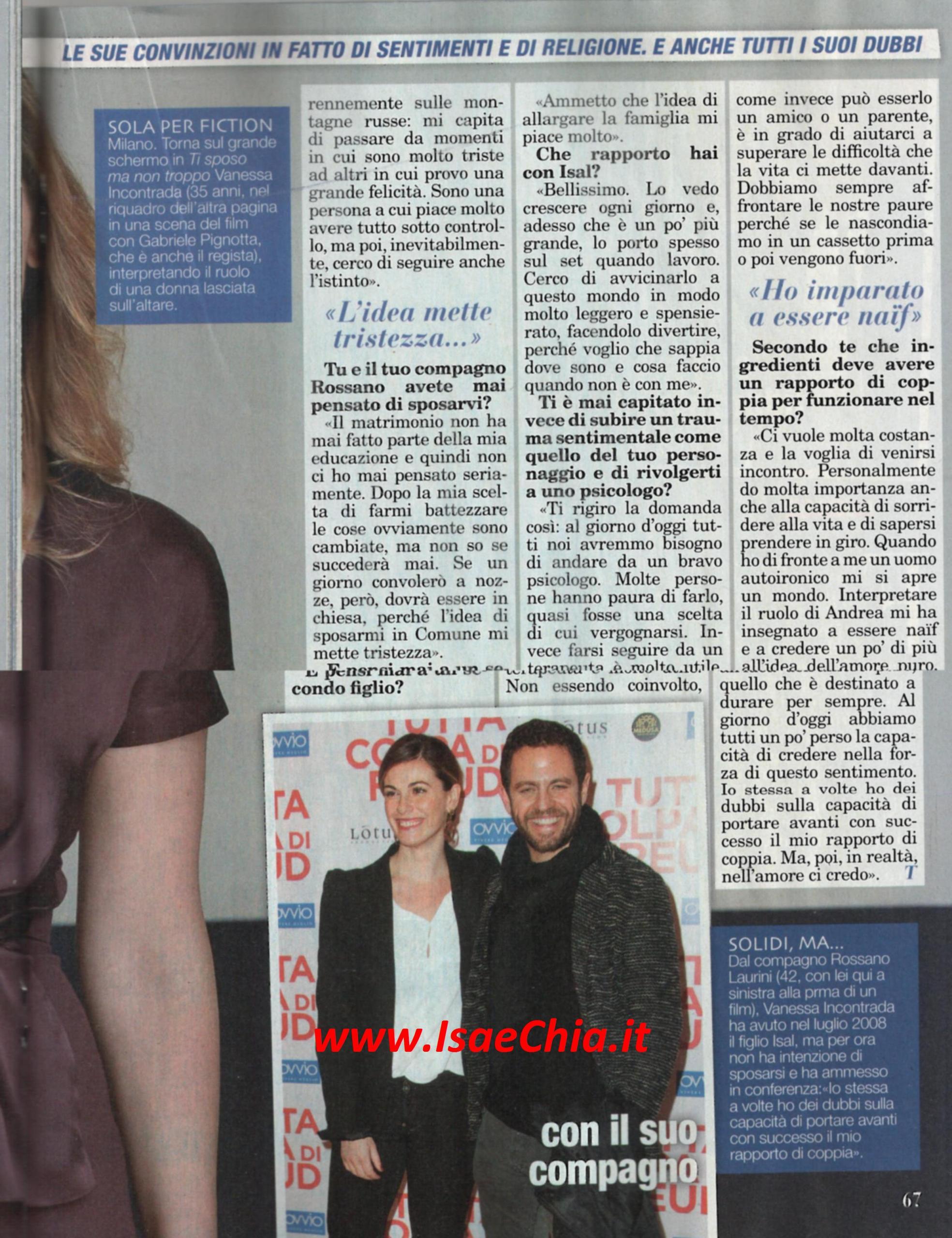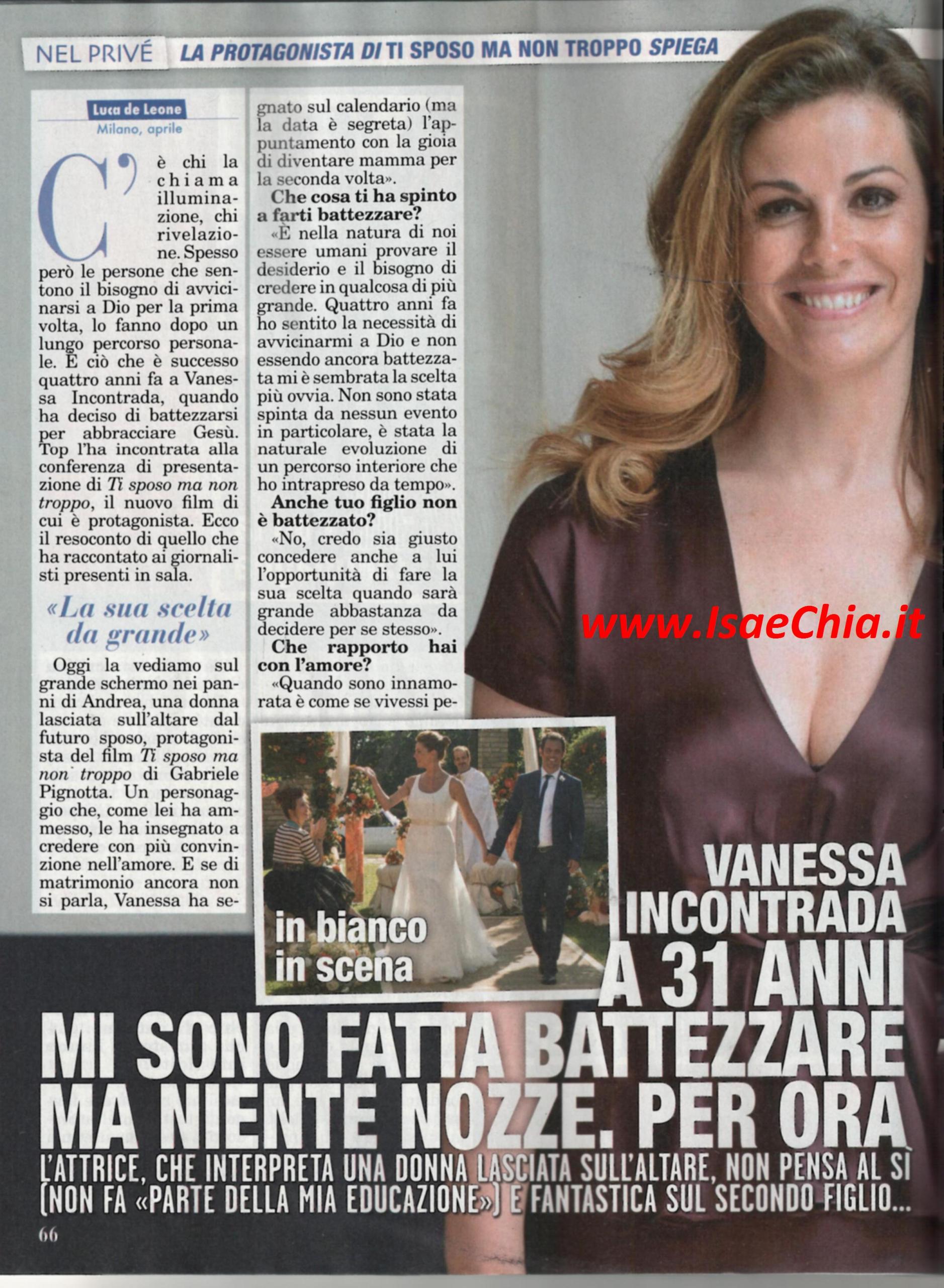 L’attrice e conduttrice Vanessa Incontrada ha deciso di farsi battezzare: “E’ nella natura di noi esseri umani provare il desiderio di credere in qualcosa più grande. Quattro anni fa ho sentito la necessità di di avvicinarmi a Dio e non essendo ancora battezzata, ho pensato fosse la scelta più ovvia. Nemmeno mio figlio è battezzato: credo sia giusto concedere anche a lui l’opportunità di scegliere quando sarà grande abbastanza da decidere per se stesso”. Quando le si chiede, invece, se lei e il compagno Rossano Laurini hanno pensato a sposarsi, risponde: “Il matrimonio non ha mai fatto parte della mia educazione, quindi non ci ho mai pensato seriamente. Dopo la mia scelta di farmi battezzare, le cose ovviamente sono cambiate ma non so se succederà mai. Se un giorno convolerò a nozze, dovrà essere in chiesa, l’idea di sposarmi in Comune mi mette tristezza. L’idea di avere un secondo figlio mi piace molto. Vedo mio figlio Isal crescere ogni giorno, adesso che è un po’ più grande, lo porto spesso sul set. Cerco di avvicinarlo a questo mondo in modo leggero, perché voglio che sappia dove sono e cosa faccio quando non è con me”. Infine, parlando dei rapporti di coppia, commenta: “Ci vuole molta costanza e la voglia di venirsi incontro. Do molta importanza anche alla capacità di sorridere alla vita e prendersi in giro: con un uomo autoironico mi si apre un mondo. Interpretare il ruolo di Andrea nel film Ti sposo ma non troppo mi ha insegnato a essere più naif e credere nell’amore puro. Al giorno d’oggi abbiamo tutti un po’ paura di questo sentimento, anch’io, ma in fondo all’amore ci credo…”