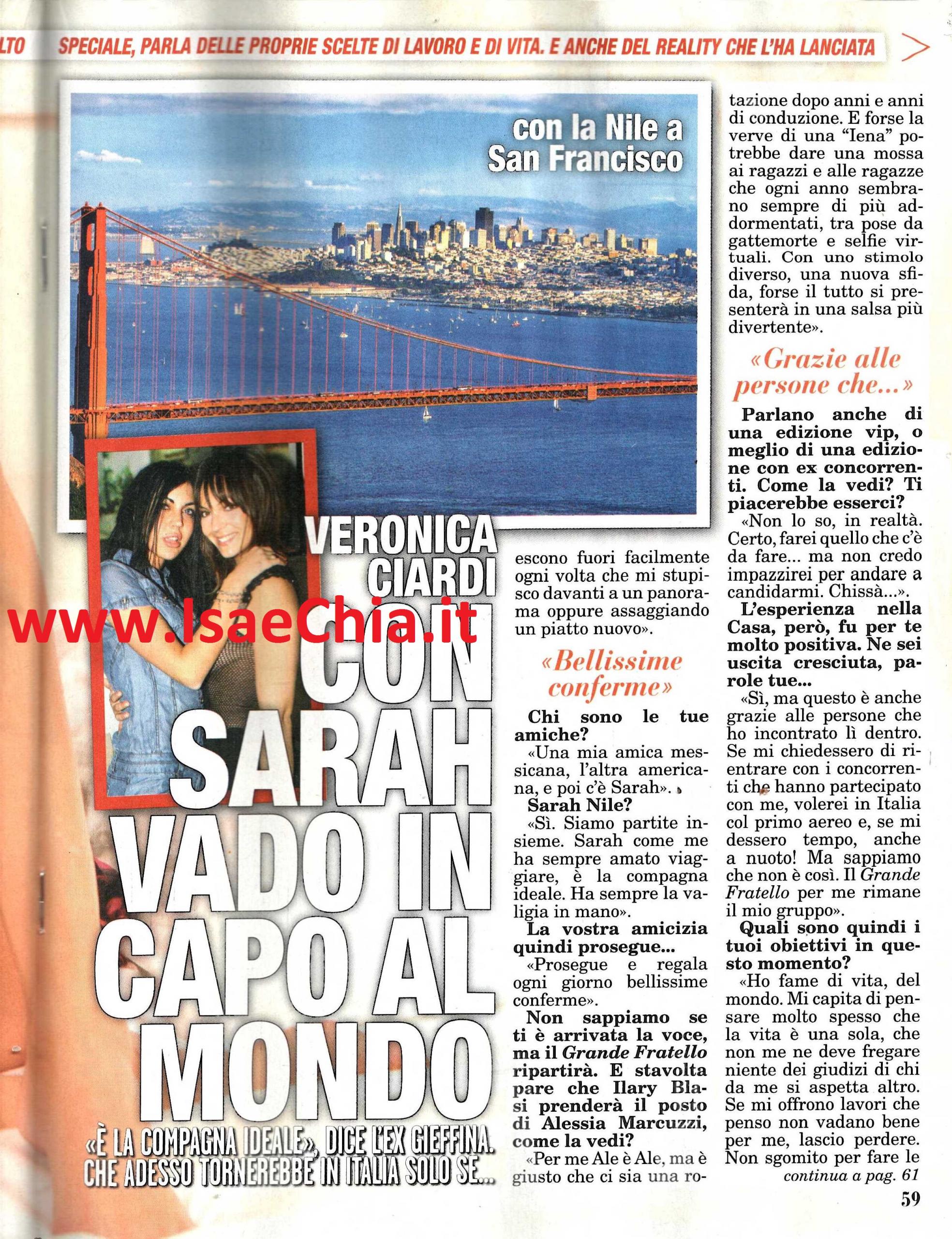 La concorrente del Grande fratello 10 Veronica Ciardi è ora in viaggio negli Stati Uniti. Intervistata, la bella romana rivela un particolare inaspettato: “Ogni viaggio per me è una nuova vita, un riassestarmi con me stessa, con quella vecchia me di cui a volte mi dimentico. Sono in viaggio con le mie amiche: una americana, una messicana e poi…Sarah Nile! Sarah, come me, ha sempre amato viaggiare, è la compagna ideale e ha sempre la valigia in mano“. Quando le si chiede quindi se la loro amicizia, nata nella Casa più spiata d’Italia e che spesso è andata oltre il concetto tradizionale di ‘amicizia’, continui, lei risponde: “Prosegue e regala ogni giorno bellissime conferme“. Parlando del programma che l’ha lanciata, il Grande fratello, e della possibilità che nella prossima edizione la conduzione sia assegnata ad Ilary Blasi, la Ciardi commenta: “Per me Alessia Marcuzzi è sempre Alessia, ma è giusto che ci sia una rotazione dopo anni e anni di conduzione. E forse la verve di una ‘Iena’ potrebbe dare una mossa ai ragazzi che ogni anni sembrano più addormentati, tra pose da gattamorte e da selfie virtuali. Con uno stimolo diverso, una nuova sfida, tutto si presenterà in una salsa più divertente”. In realtà, si parla anche di un’edizione tutta ‘Vip’ del GF, alla quale potrebbe essere invitata anche lei stessa…”Non lo so, in realtà. Certo, farei quello che c’è da fare, ma non impazzirei per andare a candidarmi. Chissà…“. E questo nonostante la sua esperienza nella Casa sia stata decisamente positiva: “Sì, ma questo è anche grazie alle persone che ho incontrato lì dentro. Se mi chiedessero di rientrare con gli stessi concorrenti che hanno partecipato con me, volerei in Italia col primo aereo, o anche a nuoto! Il Grande fratello per me rimane il mio gruppo. Al momento ho fame di vita, del mondo. Mi capita di pensare che la vita è una sola, che me ne devo fregare dei giudizi o da chi da me si aspetta altro. Se mi offrono lavori che penso non vadano bene per me, lascio perdere. Non sgomito per fare cose a tutti i costi, preferisco fare ciò che mi fa crescere. Quello che faccio deve portare serenità e gioia alle persone che mi stanno vicino. Nel mondo dello spettacolo non ci sono certezze, ma mi aggrappo a una base di positività, ricordandomi il coraggio che ho avuto in passato. E quando si pensa in positivo, succedono anche cose belle! Non ho ancora capito cosa farò ‘da grande’ e non so se voglio capirlo: si vive il presente, per cui non ci si colloca per forza in una dimensione in cui si può prevedere tutto. Coltivo me stessa e mangio ogni giorno i miei frutti. Stare ad angosciarsi su cosa si farà da grandi non ha senso“.