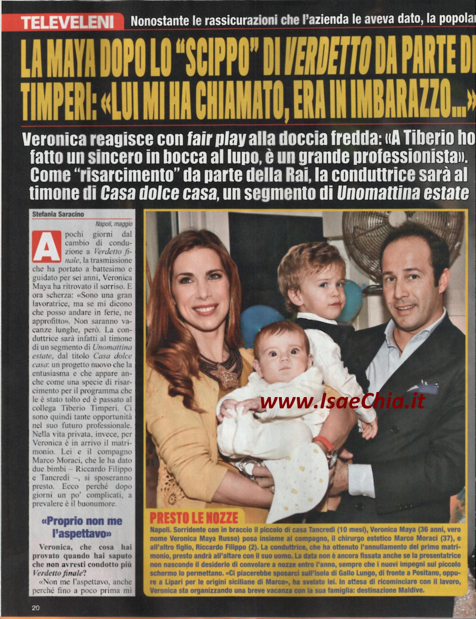 La conduttrice Veronica Maya non conduce più Verdetto finale, per scelta della Rai, che le ha concesso un po’ di “ferie”: “Non me lo aspettavo, fino a poco prima c’erano state delle rassicurazioni. Poi, però, mi sono state spiegate le necessità dell’azienda. L’ho condotto per sei anni e non uscirò di scena, perché tornerò tra poco con un segmento di Unomattina estate, ma la cosa che mi ha stupito è che il cambio di conduzione è stato fatto a fine stagione! Mi hanno spiegato che si vuole testare la conduzione maschile e che se non avrà successo, verrà cancellato: il programma non va male, fa il 6% di share, ma l’anno scorso ne prendeva l’8. Ho chiamato Tiberio Timperi, che mi ha sostituito, ed ho avvertito il suo imbarazzo, ma gli ho fatto un sincero in bocca al lupo: è un professionista. Inoltre, è bastato che io e il direttore di Raiuno Giancarlo Leone ci rincontrassimo perché tra di noi tornasse la serenità”.