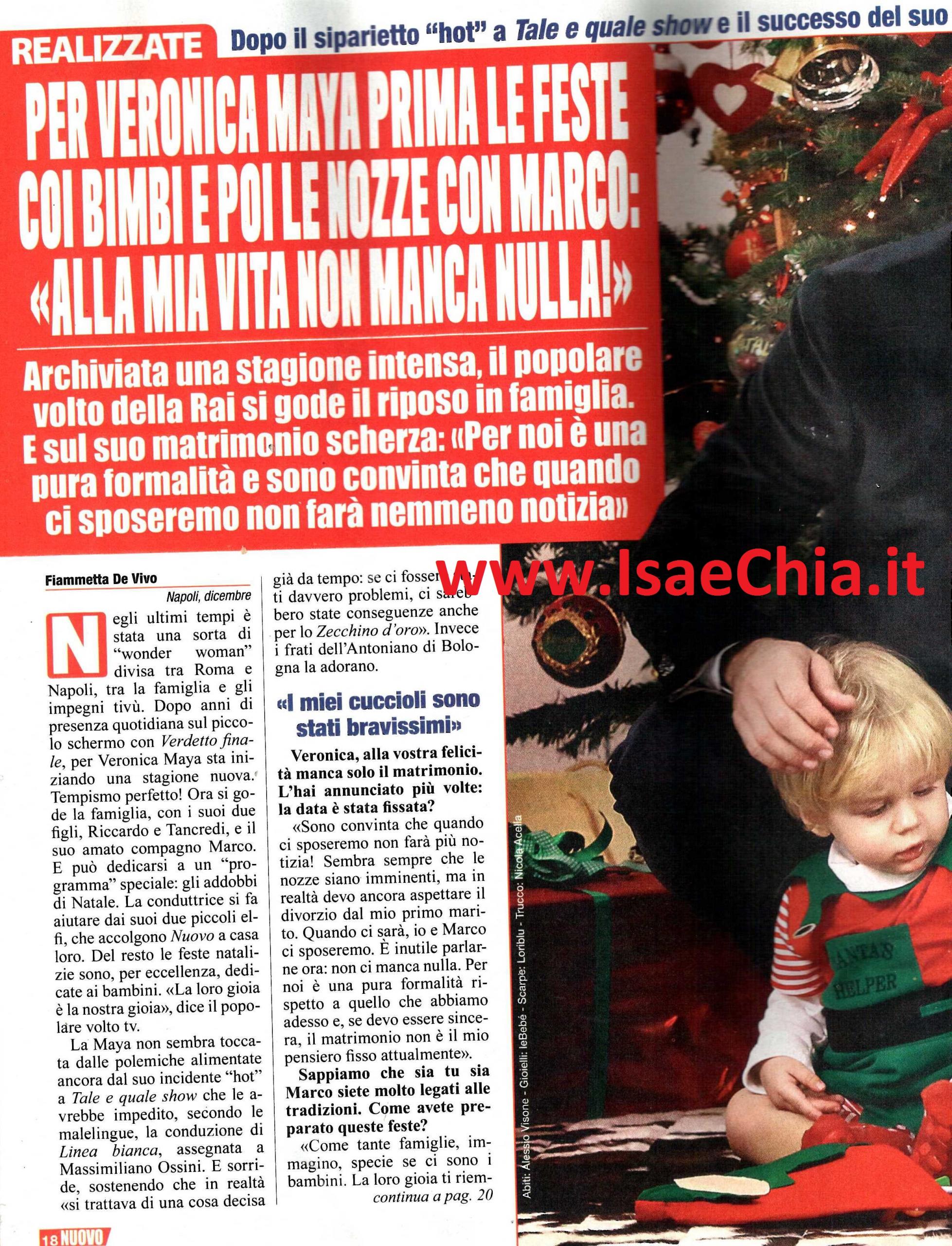 La conduttrice Veronica Maya si è divisa tra Roma e Napoli, tra la famiglia e gli impegni televisivi, ma adesso si gode le feste di Natale con il compagno Marco e i due figli Riccardo e Tancredi. Quando le si fa notare che già più volte ha annunciato le nozze, ma queste non sono ancora arrivate, lei risponde: “Sono convinta che quando ci sposeremo, non farà più notizia! Sembra sempre che le mie nozze siano imminenti, ma in realtà devo ancora aspettare il divorzio dal mio primo marito. Quando ci sarà, io e Marco ci sposeremo. E’ inutile parlarne ora, non ci manca nulla. Per noi è una pura formalità e il matrimonio non è un mio pensiero fisso attualmente. La gioia dei nostri bambini ci riempie il cuore, ti anima, ti motiva. E’ importante far capire loro l’importanza delle feste: sono stati bravissimi e ci hanno aiutato nella preparazione dell’albero e del presepe. Da quando abbiamo preso casa a Napoli, abbiamo inaugurato un Christmas Party per gli amici: preparo personalmente torte rustiche, pasta al forno, polpette, dolci tradizionali“. Dopo aver raccontato qualche dettaglio sull’educazione dei loro bambini, mirata a renderli indipendenti, Veronica parla dell’incidente che l’ha coinvolta a Tale e quale show, quando, durante un’esibizione, il vestito le è scivolato e ha mostrato il seno: “E’ stato bello lavorare con Carlo Conti e incontrare colleghi con cui poi ho legato. Ho interpretato personaggi diversi da me, giocando sul mio lato sexy. Ho imparato a conoscere alcuni miei limiti, a superarne alcun. Il programma per me è stato una grossa vetrina, nonostante qualche critica. Non è vero che mi è stata tolta la conduzione di Linea bianca perché ho mostrato il seno, era una cosa già decisa da tempo. Se ci fossero stati davvero problemi, ci sarebbero state conseguenze anche per lo Zecchino d’oro, invece i frati dell’Antoniano mi hanno confermata. Adesso mi dedico ai bambini, ma ho idee e progetti nuovi. Ogni tanto fermarsi non fa male, per ripartire meglio. Sono al termine di 10 anni ininterrotti di lavoro quotidiano, con in mezzo due gravidanze. Ho avuto soddisfazioni, ma c’è anche tanta stanchezza e mi prendo volentieri alcuni mesi di pausa. Farò una festa in casa per il compleanno di Riccardo, sono contraria alla mania di affittare locali e prendere animatori: ai bimbi serve poco. Una femminuccia? E’ il buon Dio che la manda, se vuole. Comunque, al momento, non ci pensiamo“.