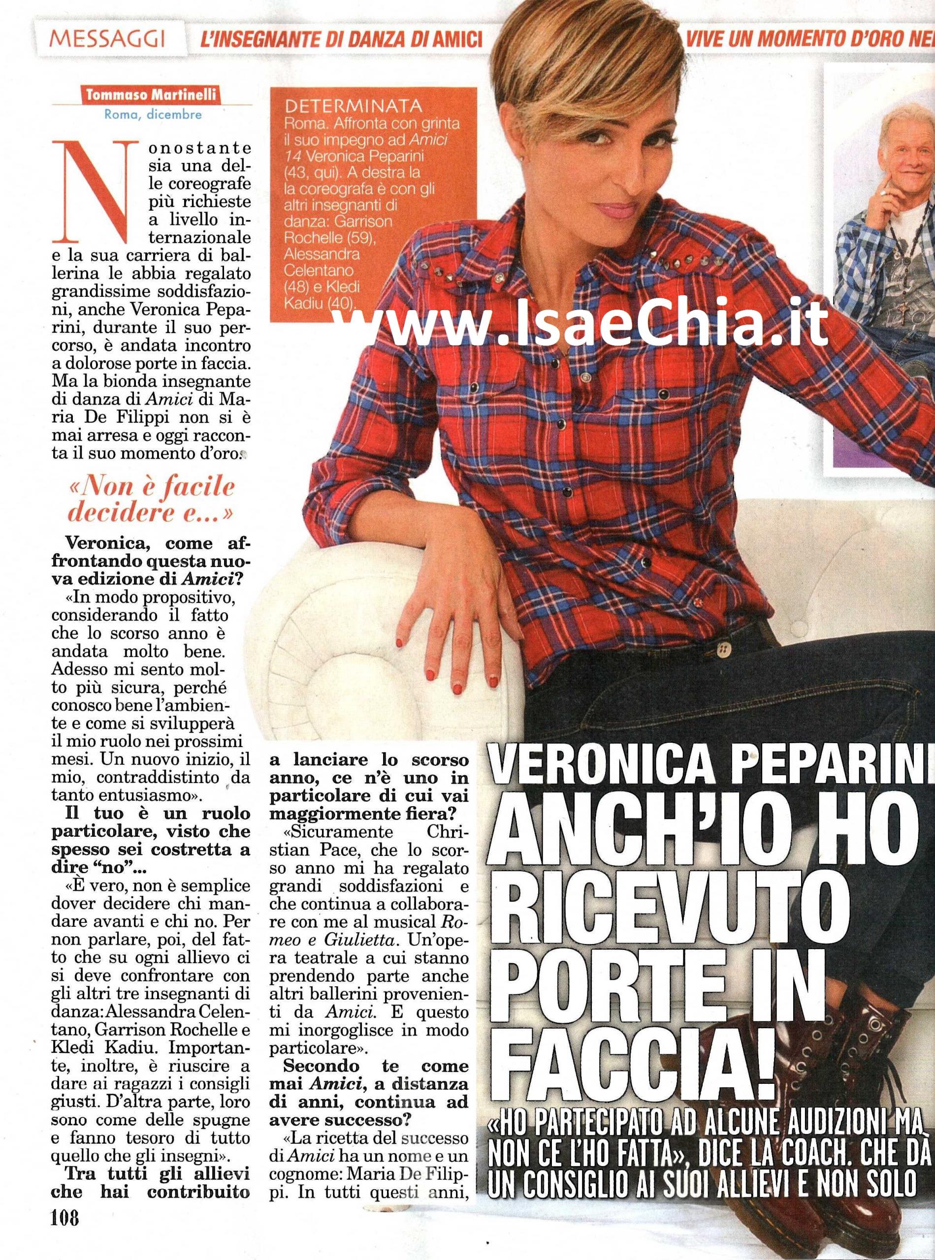Nonostante sia una delle coreografe più richieste sul piano internazionale, anche l’insegnante di danza di Amici Veronica Peparini è andata incontro a dolorose porte in faccia: “L’anno scorso ad Amici è andata molto bene, adesso mi sento molto più sicura, perché conosco bene l’ambiente e come si svilupperà il mio ruolo nei prossimi mesi. Il mio è un nuovo inizio, contraddistinto da tanto entusiasmo. Spesso sono costretta a dire di no e non è semplice decidere chi mandare avanti e chi no. Per non parlare del fatto che ogni alunno debba poi confrontarsi anche con Garrison, Alessandra Celentano e Kledi Kadiu. Tra i ballerini che ho contribuito a lanciare, sono particolarmente orgogliosa di Christian Pace, che continua a collaborare con me al musical Romeo e Giulietta, un’opera teatrale a cui stanno prendendo parte anche altri ballerini nati ad Amici. E questo mi inorgoglisce in modo particolare. Mi capita di rivedermi nei miei alunni, ma il mondo in cui io ho mosso i primi passi è diverso da quello di oggi: i ragazzi di oggi incontrano molte più difficoltà, anche se, allo stesso tempo, sono molto più svegli di quanto lo fossimo noi“. Quando le si chiede qual è il segreto del successo di Amici, Veronica risponde: “La ricetta del suo successo ha un nome e un cognome: Maria De Filippi. In tutti questi anni, lei è stata sempre in grado di intercettare la chiave giusta, al passo con i tempi e con i gusti del pubblico. Ai ragazzi della nuova classe consiglierei di guardare sempre avanti, di aprire la mente a 360 gradi. Ad Amici non si deve mai smettere d’imparare. E di non arrendersi mai, neanche di fronte a un’eventuale sconfitta, perché le sconfitte insegnano. All’inizio della mia carriera mi è capitato di andare incontro a qualche sconfitta, come quando ho fatto delle audizioni per poter partecipare ad alcune trasmissioni televisive, ma non ce l’ho fatta. Però non mi sono mai persa d’animo, anzi, ho sempre reagito. Se uno crede in quello che fa, non si deve fermare mai!“. Infine, rivela come concilia il lavoro con il ruolo di mamma: “Non lo so nemmeno io, cerco di incastrare i vari pezzi. Sono mamma di due bambini ma per fortuna i miei genitori mi danno una mano. Vorrei che in futuro i miei figli facciano quello che davvero vogliono, ma magari decideranno di seguire le mie orme, o quelle paterne (il ballerino e coreografo Fabrizio Prolli) o dello zio Giuliano. E’ un mestiere faticoso, ma non lo sconsiglierei mai a nessuno, viste le emozioni che mi ha regalato. Quindi, se un giorno i miei figli mi diranno che vogliono lavorare nella danza, ben venga!“