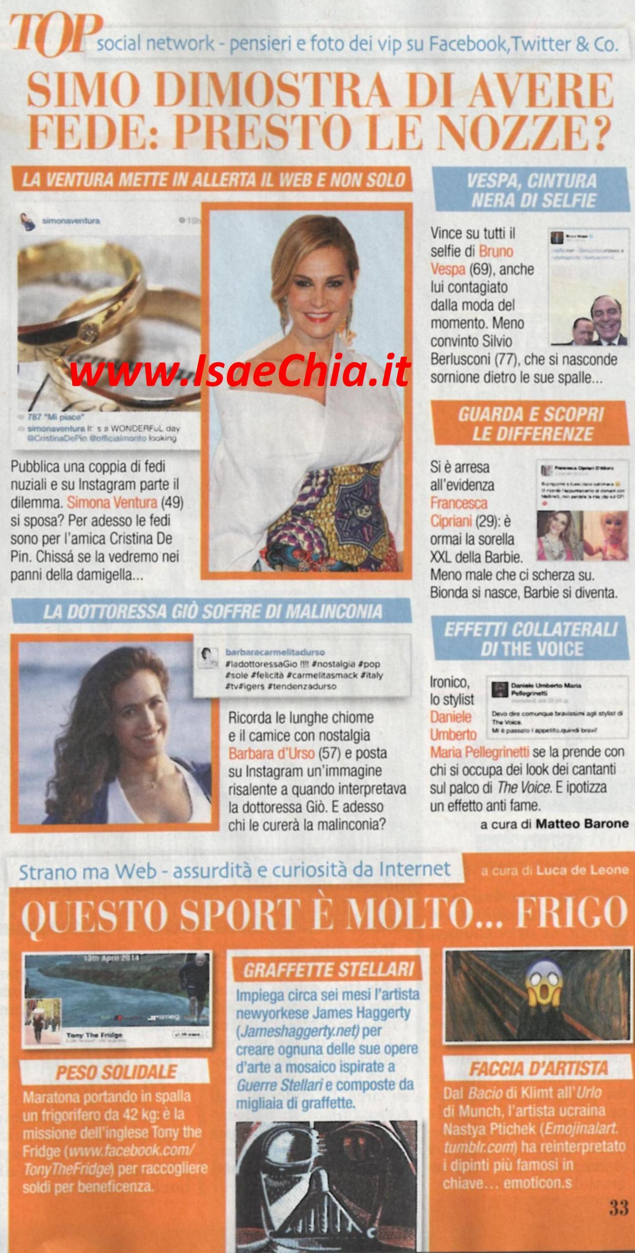 Pubblica una coppia di fedi nuziali su Instagram ed inizia il dilemma: Simona Ventura sta per sposarsi? Poi, però, si è scoperto che erano di Cristina De Pin, neo-sposa del calciatore Riccardo Montolivo. Ma che anche super Simo stia pensando al grande passo con Gerò Carraro? La sua collega Barbara D’Urso, invece, ha postato una nostalgica foto di quando interpretava la dottoressa Giò. Chi le curerà la malinconia?