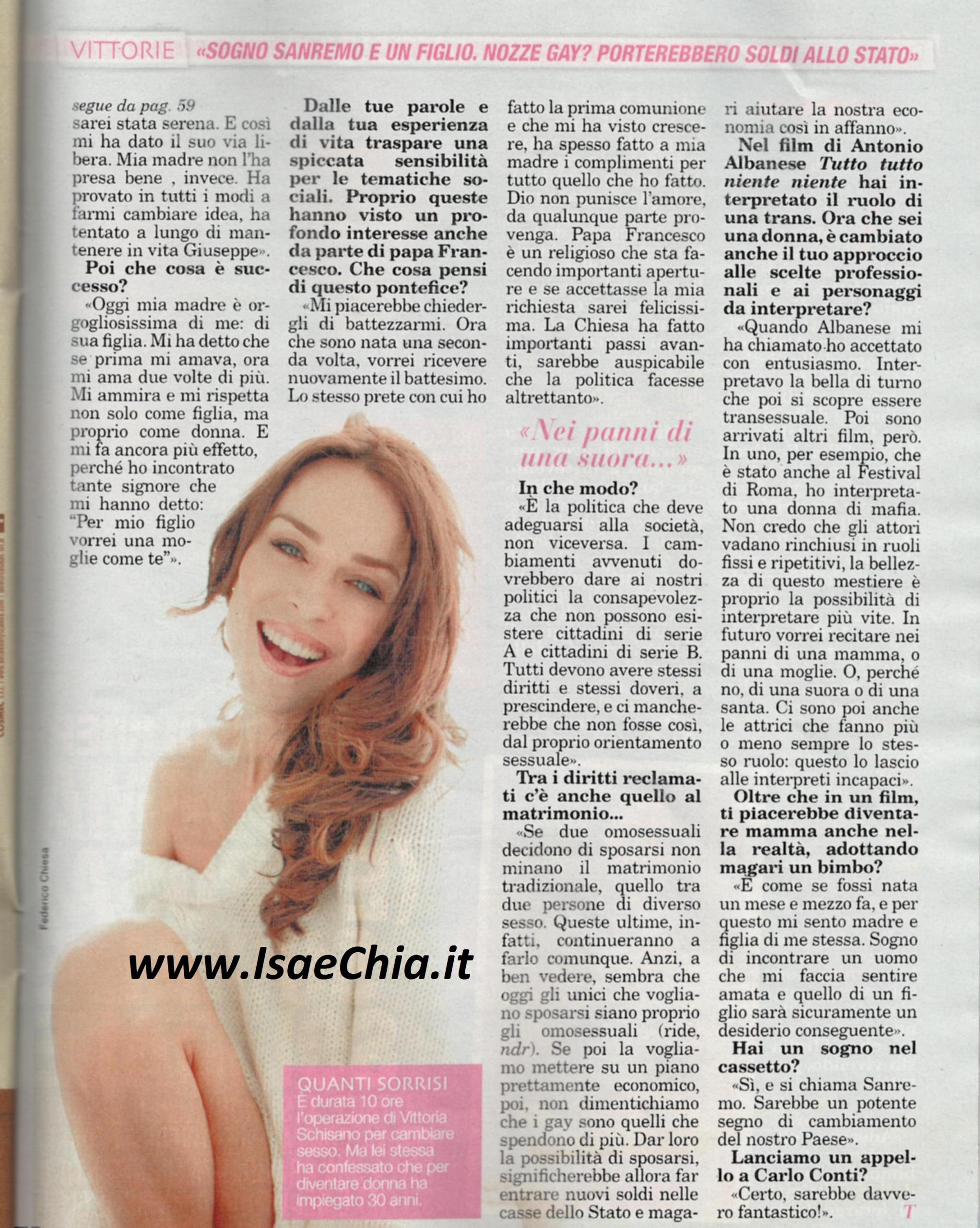 L’attore Giuseppe Schisano non esiste più: al suo posto c’è Vittoria: “Mi sento serena e vittoriosa. Come personaggio pubblico mi sento una grossa responsabilità, perché posso essere un modello di riferimento per molti, non sono per coloro che vogliono intraprendere il mio stesso percorso, ma anche per le ragazze che mi ammirano come modello di coraggio e tenacia. Mi fa tristezza pensare che i giovani di oggi non abbiano sogni da coltivare. Ho scelto di partecipare alla trasmissione di La7 Announo perché mi piace l’idea di dire la mia sui vari argomenti, sono sensibile alle tematiche sociali. In questo momento do voce alle persone che non ne hanno: se mi arriveranno altre proposte, mi metterò al servizio degli altri e farò, perché no, anche politica”. Parlando del suo percorso, dice: “Mi nascondevo dietro una faccia e un nome che non mi appartenevano. La mia più grande difficoltà è stata dire la verità a me stessa: le risposte più complicate vanno date a noi stessi. Poi viene facile anche parlare coi genitori. Per loro non è stato facile, perché hanno dovuto “uccidere” Giuseppe affinché nascesse Vittoria. Giuseppe era una presenza ingombrante, il “figlio perfetto” a cui dovevano rinunciare. Quando l’ho detto a mio padre, lui è stato in silenzio per un po’, poi mi ha chiesto se pensavo di essere felice poi. Mia madre, invece, ha cercato di farmi cambiare idea in tutti i modi. Oggi è orgogliosissima di me: sono sua figlia, mi ama due volte di più. Ora che sono nata una seconda volta, mi piacerebbe ricevere nuovamente il battesimo. Lo stesso prete che mi ha visto prendere la prima comunione ha fatto i complimenti a mia madre per tutto quello che ho fatto. Papa Francesco sta facendo grandi aperture e se accettasse la mia richiesta, sarei felicissima”. Dopo essersi espressa a favore dei matrimoni omosessuali e aver parlato della sua esperienza come attrice, lancia un altro appello: “Ho un altro sogno e si chiama Sanremo: sarebbe un importante segno di cambiamento nel nostro Paese” e si rivolge così a Carlo Conti, conduttore del prossimo Festival.