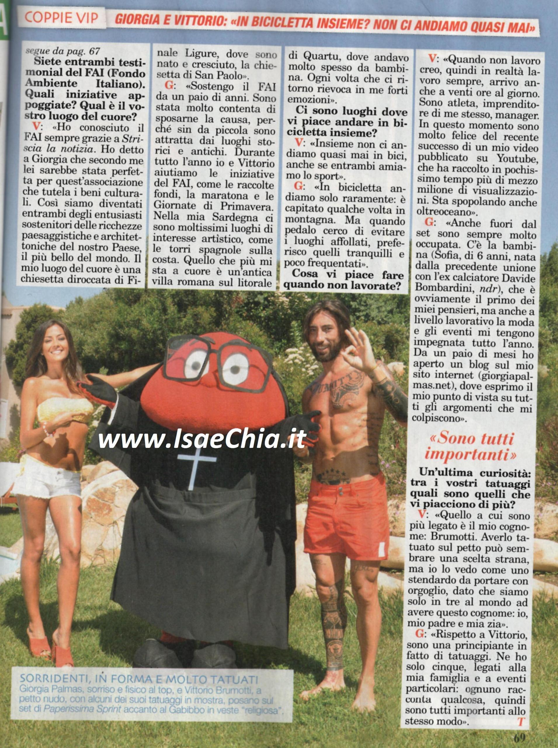 La vincitrice dell’Isola dei famosi 8 Giorgia Palmas conduce Paperissima Sprint insieme al fidanzato Vittorio Brumotti da tre anni: “Del programma mi piace la possibilità di poter essere me stesso, un eterno Peter Pan che ogni giorno ne combina una” dice il campione di bike trial. “A me piace il fatto che regali risate e che è rivolto alle famiglie, in particolare ai bambini” dice l’ex Velina. “Spesso combino papere anch’io con la bici e attraverso zone pericolose, infatti consiglio sempre di non imitarmi mai” dice lui, anche se lei spiega: “Non posso vivere sempre con la preoccupazione: mi fido di lui, che si allena molto”. I due si sono conosciuti proprio grazie al programma e confessano: “Di lei, oltre alla bellezza, mi ha colpito la professionalità”. “Di lui ciò che mi colpisce ancora oggi: l’energia”. Ma forse non tutti sanno che questa coppia ha a cuore coloro che sono colpiti da SMA (Atrofia Muscolare Spinale) e sostengono l’ASAMSI Onlus: “E’ iniziato quattro anni fa, quando ho conosciuto Dieghino, un bambino che abita vicino casa mia” racconta Vittorio. “Era mio fan e abbiamo deciso di fare una raccolta fondi per lui e grazie a Striscia siamo riusciti a raccogliere 160.000 euro”. La Palmas aggiunge: “Sono felice di aver conosciuto questi bambini e le loro famiglie, persone forti e sempre positive. Della loro malattia si parla poco e spero di sensibilizzare l’opinione pubblica su questo tema”. Inoltre, entrambi sono testimoni del FAI (Fondo Ambiente Italiano): “L’ho conosciuto tramite Striscia e ho detto a Giorgia che secondo me sarebbe stata perfetta per quest’associazione che tutela i beni culturali, così siamo diventati sostenitori delle bellezze paesaggistiche del nostro Paese. Il mio luogo del cuore è una chiesetta di Finale Ligure, dove sono nato” dice lui, mentre lei racconta: “La mia Sardegna è ricca di luoghi d’interesse artistico, come l’antica villa romana sul litorale di Quartu, dove andavo da bambina”. Infine, i due concludono con qualche curiosità: “Quando non lavoro, creo, quindi in realtà lavoro sempre. Sono imprenditore e manager e ho avuto molto seguito con un video su Youtube” dice Vittorio. Giorgia, invece: “Anche fuori dal set sono impegnata con mia figlia Sofia e da un paio di mesi ho aperto un blog dove dico la mia su tutti gli argomenti che mi colpiscono”.