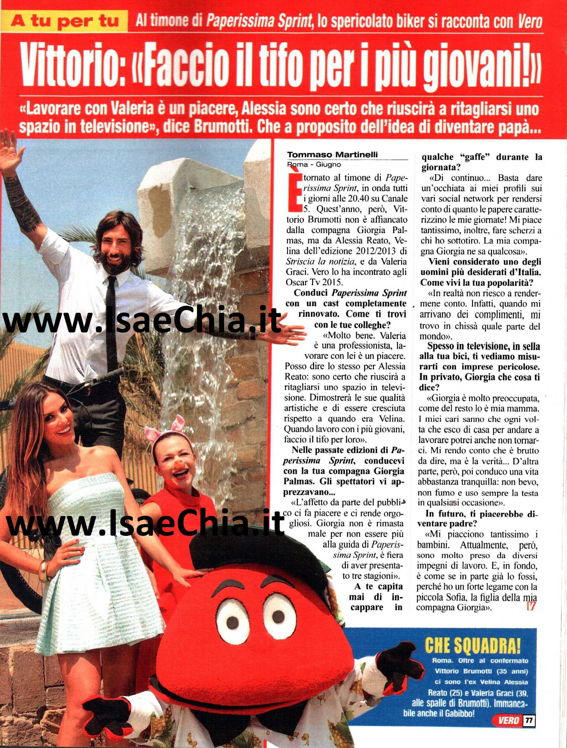 Quest’anno, al timone di Paperissima Sprint, Vittorio Brumotti non è più in coppia con la sua fidanzata Giorgia Palmas: al suo posto, infatti, c’è un’altra ex Velina, Alessia Reato, accompagnata da Valeria Graci e il suo personaggio Peppia Pig. “Valeria è una professionista e lavorare con lei è un piacere. Lo stesso vale per Alessia, che sono sicuro saprà ritagliarsi il suo spazio in tv: dimostrerà le sue qualità artistiche e di essere cresciuta rispetto a quando era Velina. Quando lavoro con i più giovani, faccio il tifo per loro! Giorgia non è rimasta male per non esser stata confermata, è fiera di aver presentato Paperissima Sprint per tre stagioni“. Quando gli si chiede come vive la sua popolarità e se gli capita di fare delle gaffe, come quelle che mostrano in tv, il campione di bike trial risponde: “Basta andare sui miei social network per rendersi conto delle papere che faccio ogni giorno! Inoltre, mi piace tantissimo fare gli scherzi a chi ho sotto tiro. E Giorgia ne sa qualcosa! Non sempre mi rendo conto della popolarità: quando mi arrivano i complimenti spesso mi trovo in chissà quale altra parte del mondo!“. Infine, quando gli si chiede se vorrebbe diventare padre e magari dare un fratellino a Sofia, la bambina che Giorgia ha avuto dall’ex compagno Davide Bombardini, Brumotti risponde: “Mi piacciono tantissimo i bambini. Però attualmente sono molto preso da diversi impegni di lavoro. E in fondo è come se lo fossi già, perché ho un forte legame con Sofia. Giorgia e la mia mamma si preoccupano per il lavoro che faccio, perché sanno che potrei uscire e potrei anche non tornare a casa. Ma al contempo sono molto tranquillo: non bevo, non fumo e uso sempre la testa in qualsiasi occasione!”.
