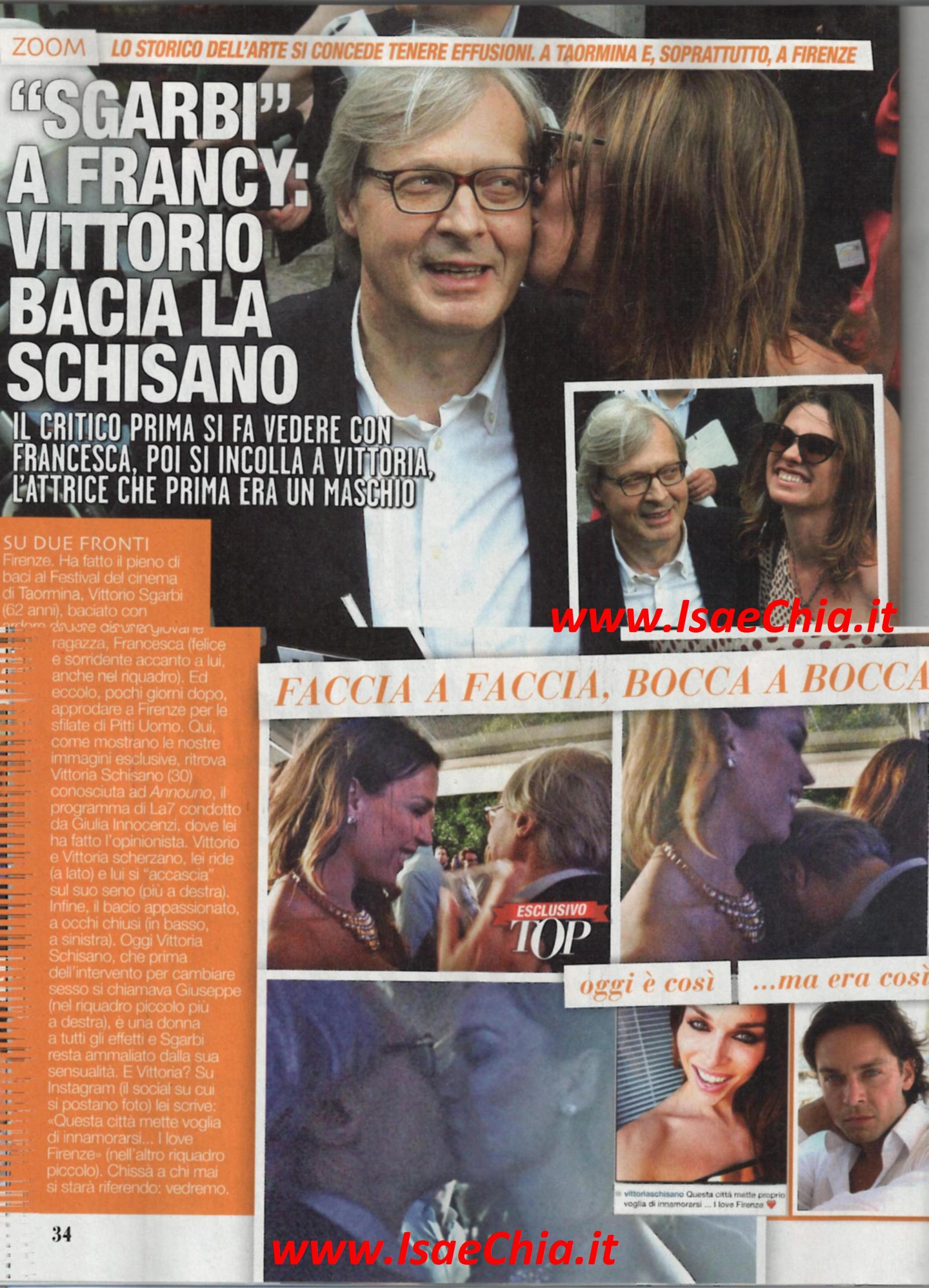 Ha fatto il pieno di baci al Festival del Cinema di Taormina il critico Vittorio Sgarbi, 62 anni, con la giovane ragazza di nome Francesca che lo accompagnava per l’occasione. Ma pochi giorni dopo, a Firenze, in occasione delle sfilate per Pitti uomo, ha ritrovato Vittoria Schisano, conosciuta nel programma di La7 Announo, dove lei era opinionista. Lui scherza con la bella attrice (che è nata uomo e ha esordito in tv come Giuseppe Schisano) e tra una risata e l’altra si accascia sul suo seno. Infine, arriva un bacio ad occhi chiusi, immortalato dai fotografi. Insomma, anche se lei prima era un uomo, Vittorio resta ammaliato dal suo fascino. E lei? Lei commenta così su Instagram: “Questa città mette proprio voglia di innamorarsi. I love Firenze!”