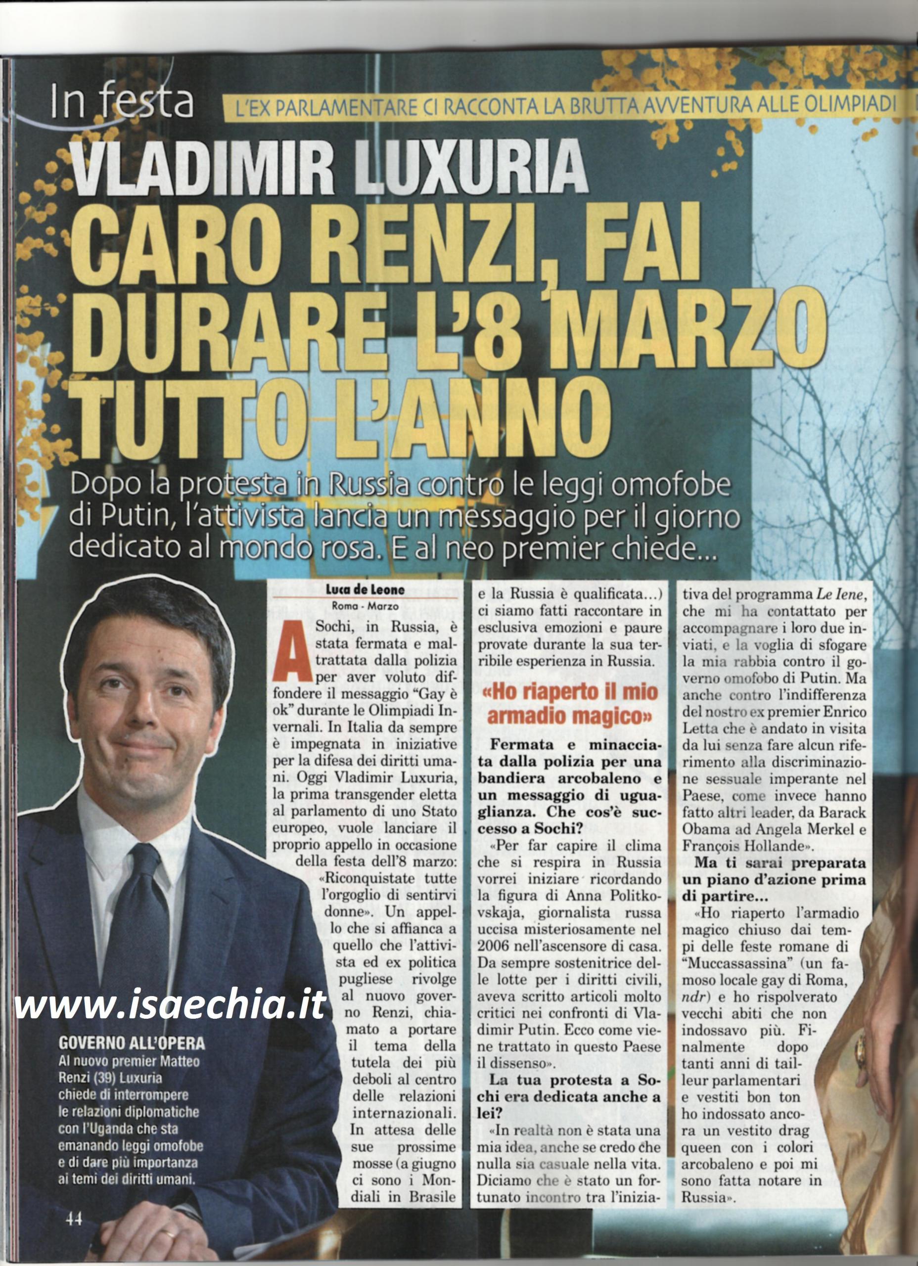 La vincitrice dell’Isola dei famosi 6 Vladimir Luxuria è stata arrestata a Sochi, in Russia, per aver diffuso il messaggio “Gay è ok”: “Per far capire il clima che si respira in Russia vorrei ricordare la figura di Anna Politkovskaja, una giornalista uccisa misteriosamente nel 2006 nell’ascensore di casa, che aveva scritto molti articoli critici nei confronti di Vladimir Putin: ecco come viene trattato il dissenso. La mia presenza a Sochi è nata da un incontro col programma Le Iene, che mi ha chiesto di accompagnare i loro inviati. Ma è anche una protesta contro l’indifferenza di Enrico Letta che è andato in visita da Putin senza fare alcun cenno alla discriminazione sessuale imperante nel Paese. Ho riaperto l’armadio magico con gli abiti che indossavo al locale gay Muccassassina e, finalmente, dopo tanti abiti bon ton da parlamentare, ho rimesso quelli da drag queen con i colori arcobaleno. La prima volta mi hanno fermato perché portavo la scritta Gay è ok. La seconda, stavo andando a vedere una partita di hockey e i poliziotti mi hanno strattonata e buttata per terra, mi hanno sbattuto in macchina e portata in aperta campagna. Mi sono buttata con la faccia a terra e mi aspettavo un colpo di manganello, invece sono andati via ed io sono scoppiata a piangere. Al governo Renzi chiedo di interrompere i rapporti con l’Uganda, che sta emanando orribili leggi contro i gay. Per le donne mi auguro che siano messe in condizione di autodeterminarsi, di esser libera di indossare una minigonna senza paura di un’aggressione. Solo così l’8 marzo durerà davvero ogni giorno dell’anno”.