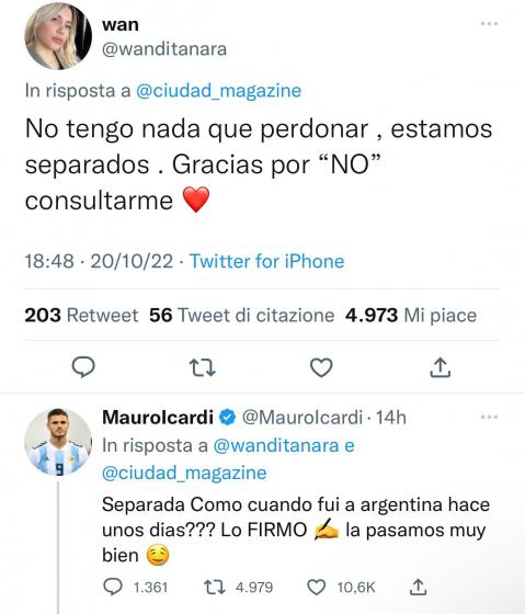 Dopo i tanti botta e risposta, la coppia ha nuovamente dato spettacolo su Twitter. Poche ore fa Wanda Nara ha voluto confermare ancora una volta la separazione dal calciatore, papà delle sue due ultimogenite: